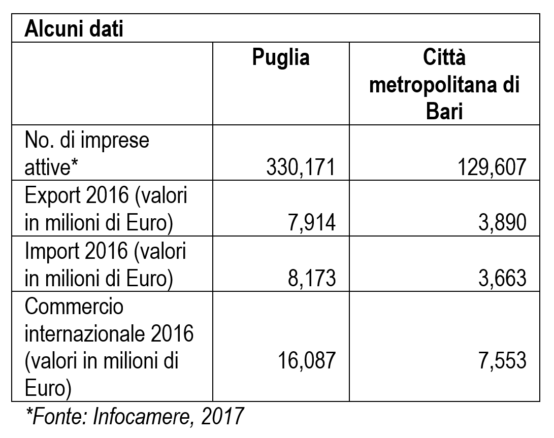 Nel panorama regionale, la città di Bari si è sempre distinta per il suo dinamismo e la sua propensione internazionale che hanno determinato, negli anni, buoni risultati economici, uno sviluppo sostenuto dell’export e delle partnership internazionali., persino durante il recente periodo di crisi economica e finanziaria internazionale.