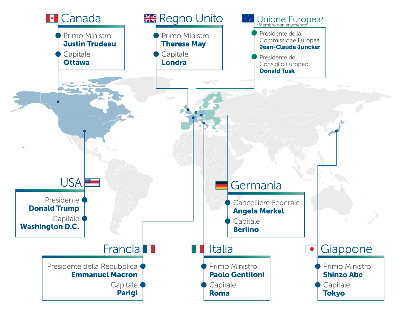 Il 26 e 27 maggio si è tenuto a Taormina il Vertice dei Capi di Stato e di Governo del G7, il gruppo delle principali economie industrializzate del quale fa parte, come membro non enumerato, anche l’Unione Europea. È stata la sesta Presidenza del G7 dell’Italia. La prima occasione fu nel 1980 a Venezia. La città lagunare ha ospitato anche il Vertice nel 1987 e successivamente è stata la volta di Napoli nel 1994, Genova nel 2001 e L’Aquila nel 2009.